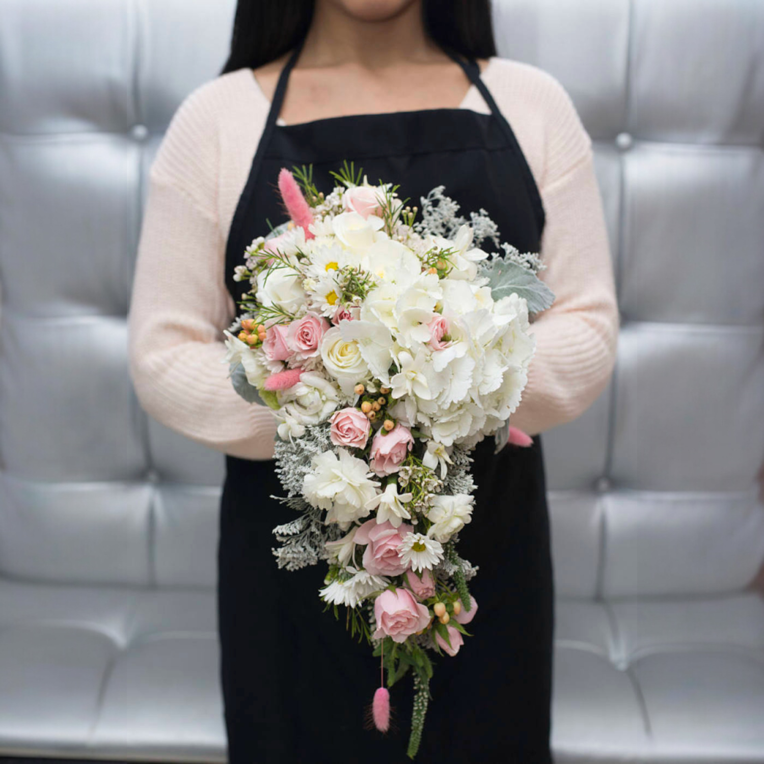 Descubre nuestro Bouquet Cascada, que lleva rosas blancas, clavel importado y una mezcla de mix flores en tonalidades pasteles de alta calidad.