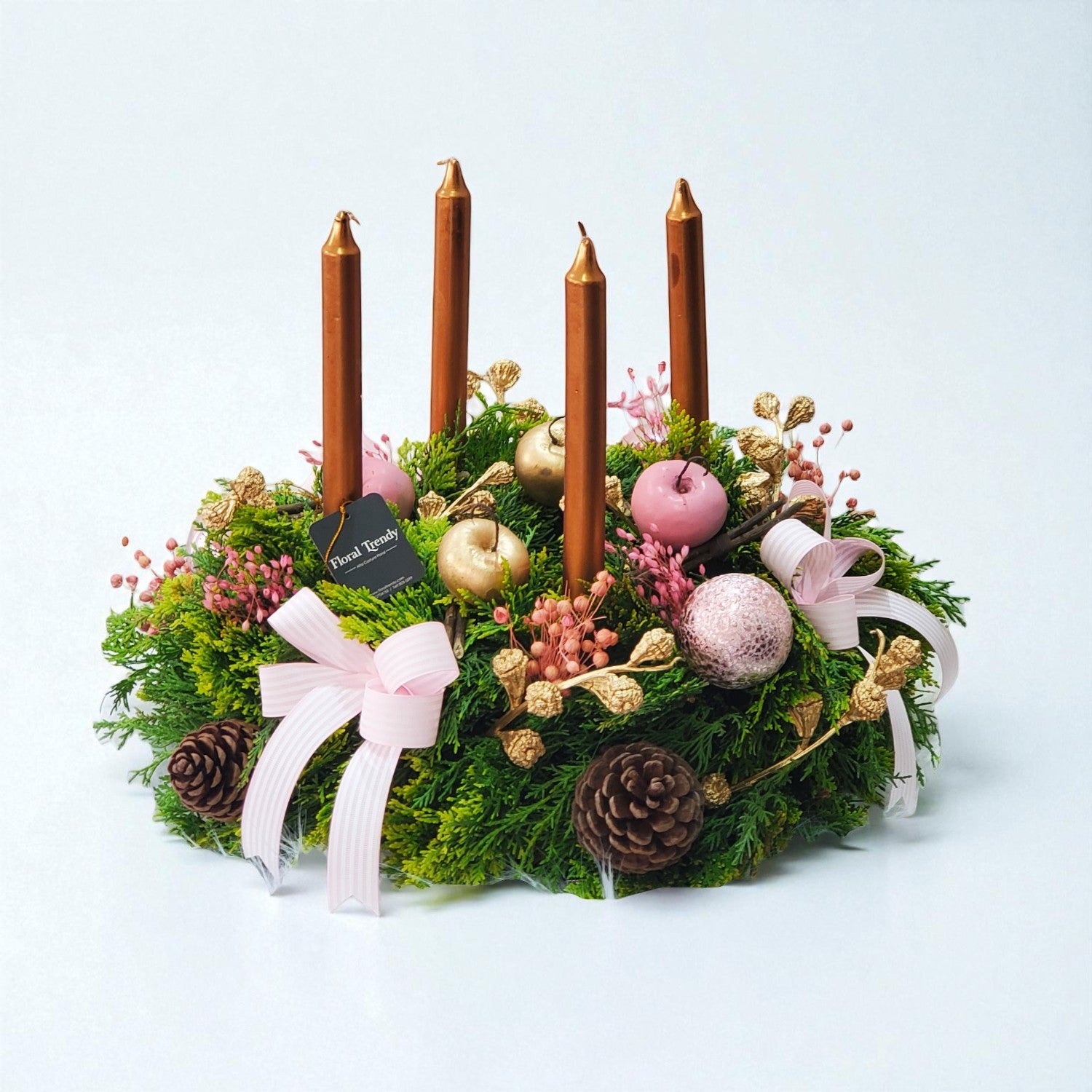 En esta Navidad te presentamos nuestra " Corona de Adviento Rosada", un arreglo floral exquisito que combina follajes verdes y fantasías. Este arreglo es perfecto para esta navidad, ya que es un signo de esperanza para la preparación de esta fiestas.