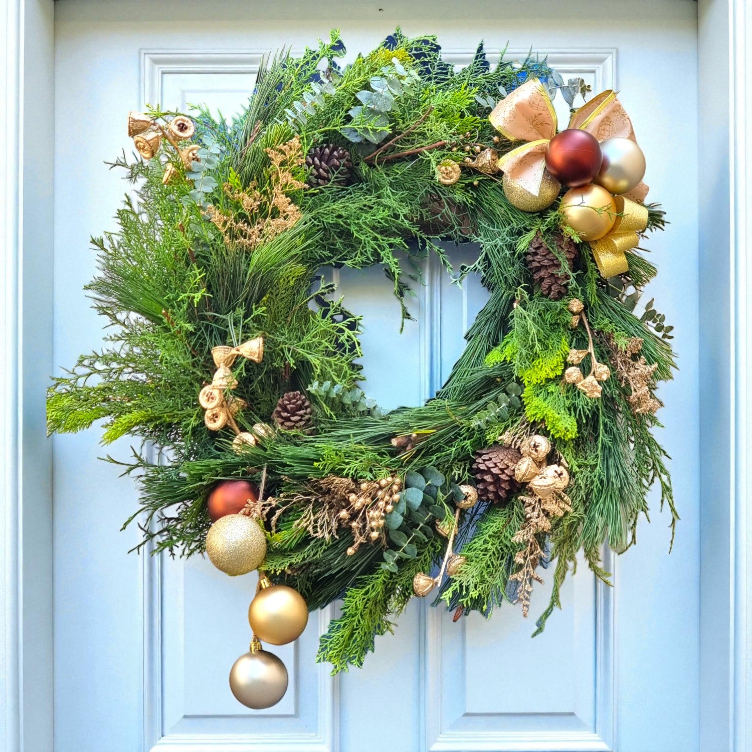 En esta Navidad te presentamos nuestra " Corona de Puerta dorada", un arreglo floral exquisito que combina follajes verdes y fantasías. Este arreglo es perfecto para esta navidad, ya que es un signo de esperanza para la preparación de esta fiestas.