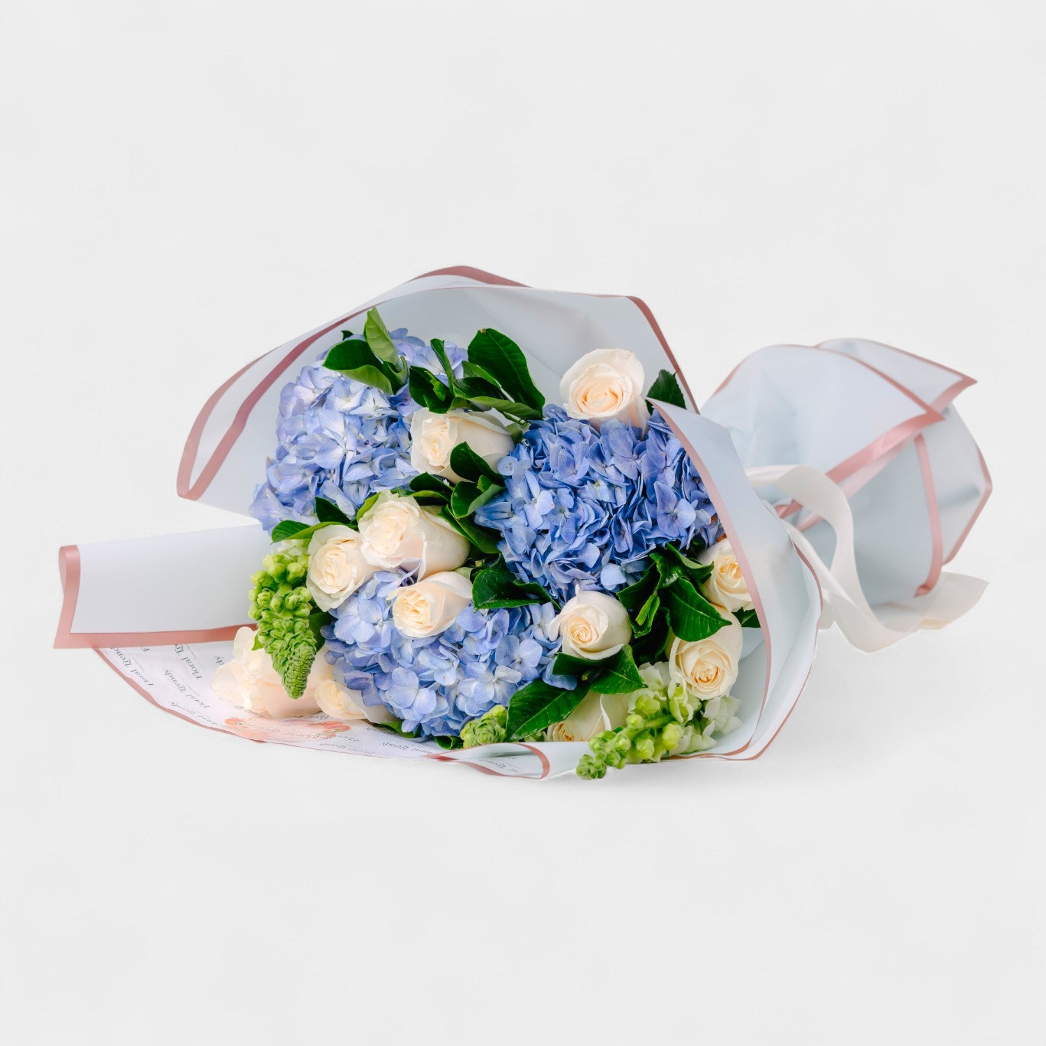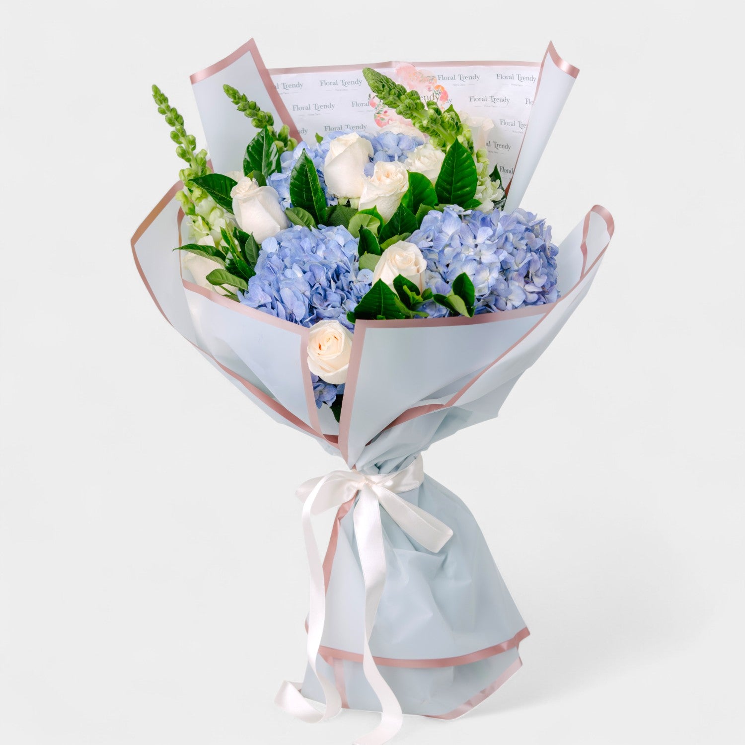 Descubre el encanto del "Ramo Blue", un arreglo floral exquisito que combina 12 rosas blancas frescas, hortensias y toque de follaje y mix de flores de alta calidad, presentado en una envoltura de papel coreano. Este ramo es perfecto para expresar amor, admiración y elegancia, ideal para aniversarios, cumpleaños o cualquier ocasión especial en la que quieras sorprender a alguien con un gesto romántico y cómodo.